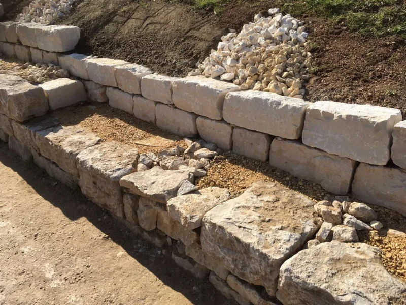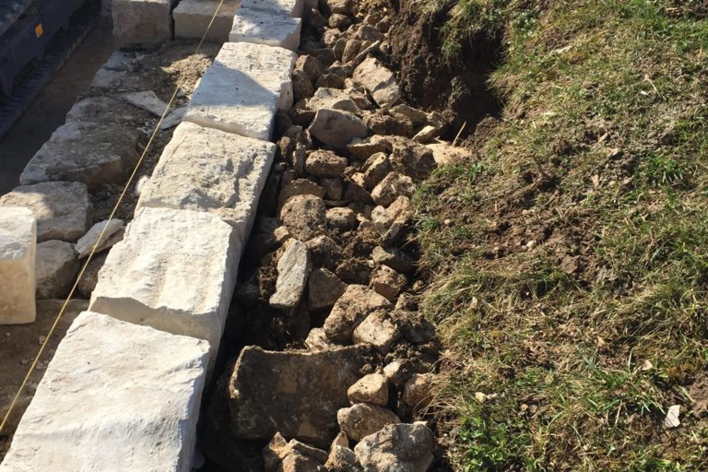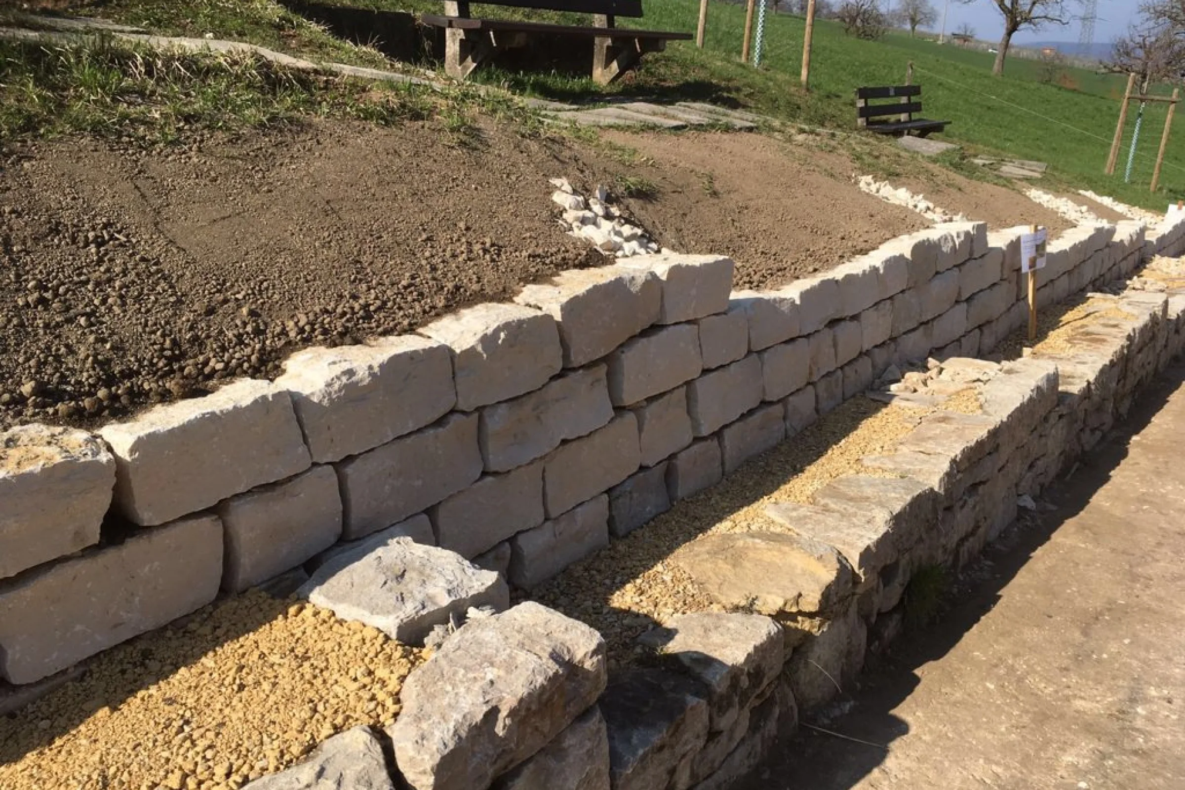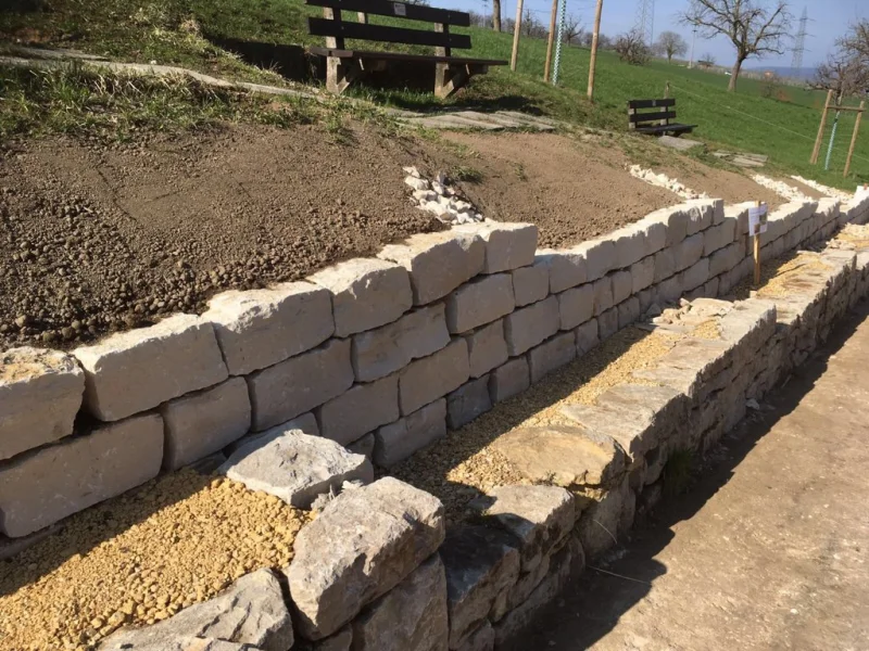 Die Frösche werden jeweils in den Mauerfugen und vorallem hinter der Mauer im sandigen und steinigen Material überwintern. Bei den Arbeiten war darauf zu achten, dass die Fugen zwischen den Steinen genügend gross ausgebildet wurden. Ausserdem wurde beim Hinterfüllen der Mauer auf ein sonst übliches Geotextil verzichtet. Ein solches Vlies würde den Durchgang durch die Steinfugen bis in das sandige Material für die Frösche versperren. Für die Mauer, wie auch für die Hinterfüllung wurde heimischer Jura-Kalk verwendet.