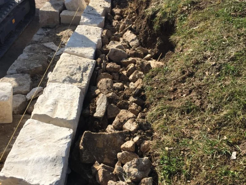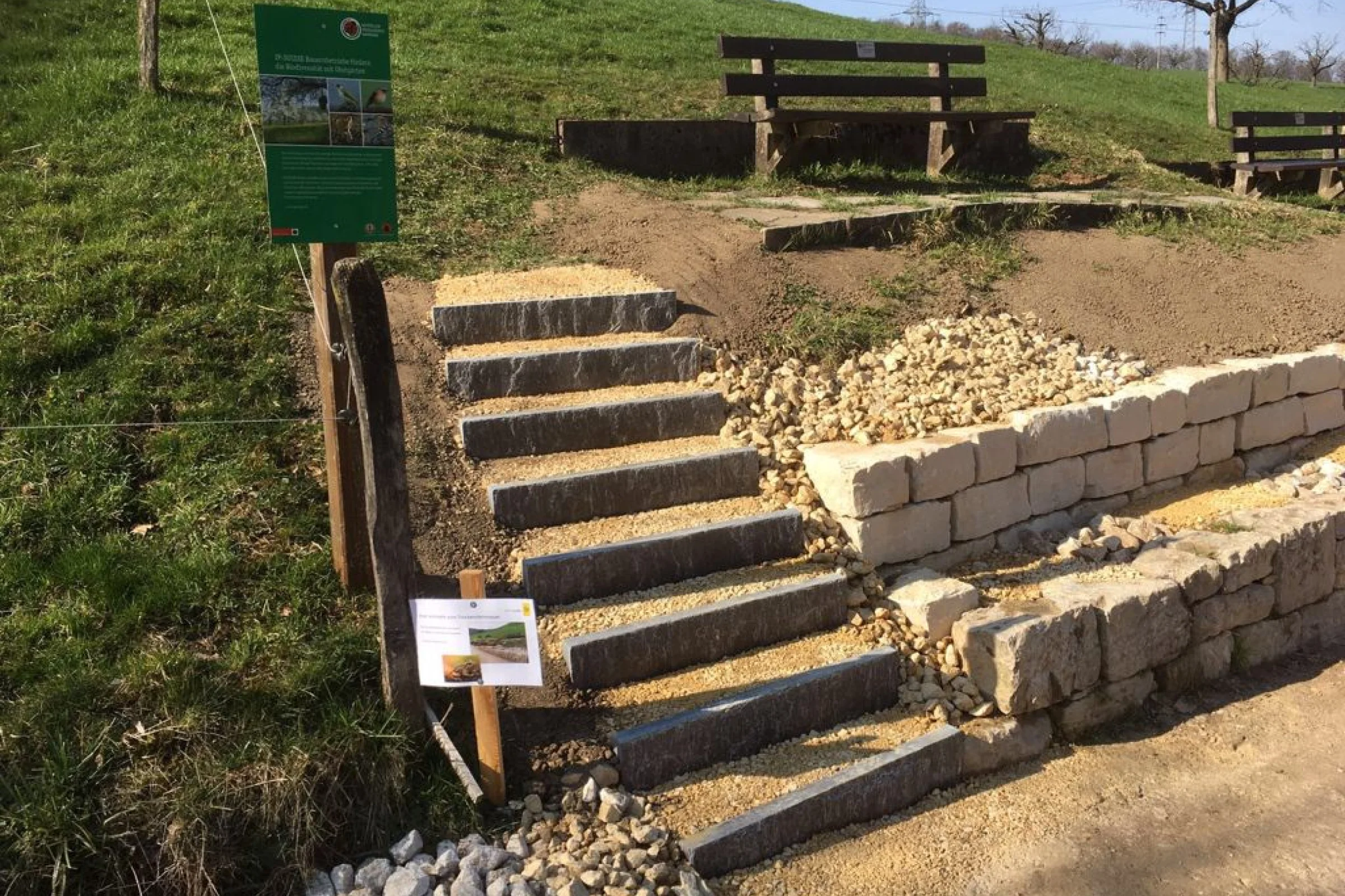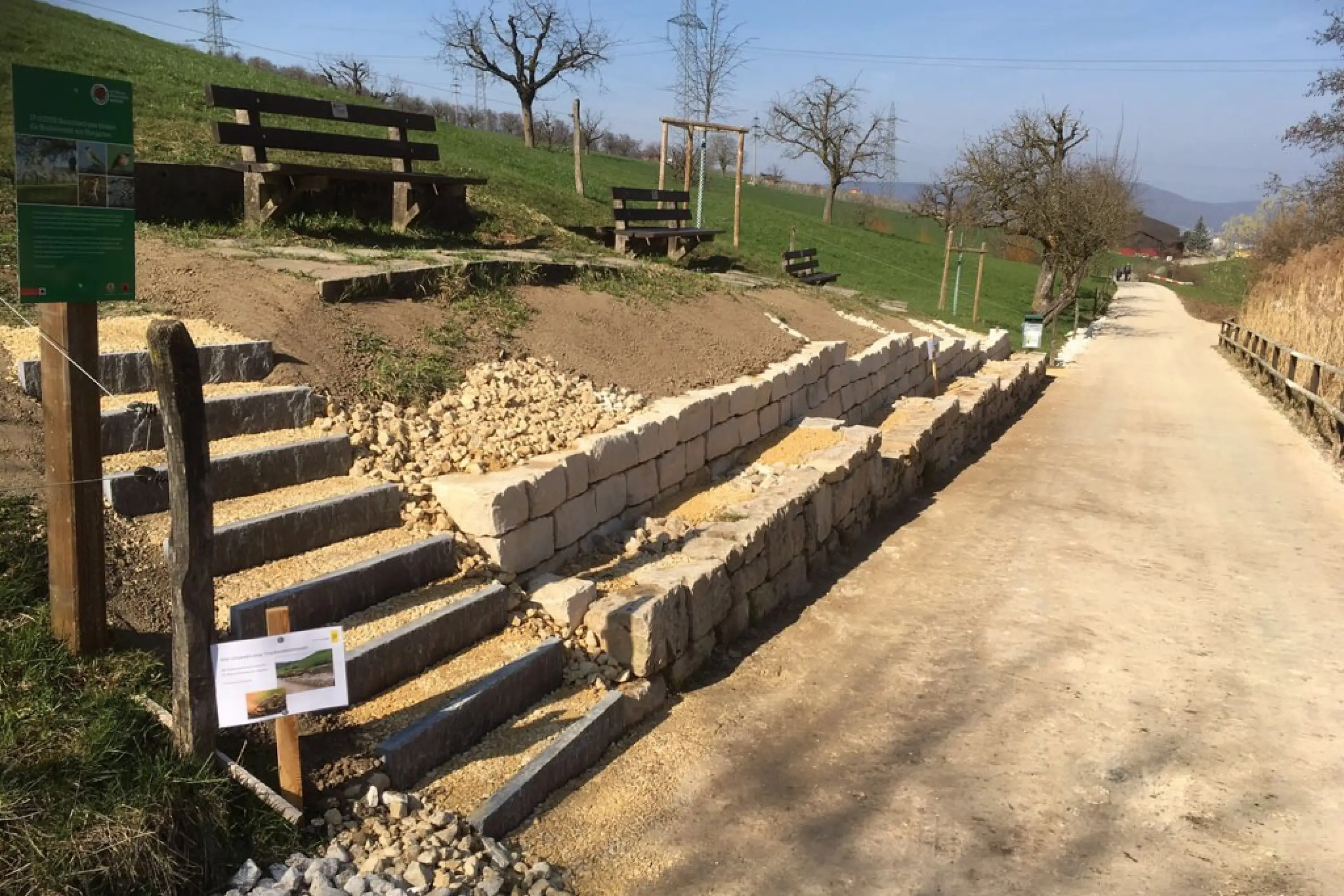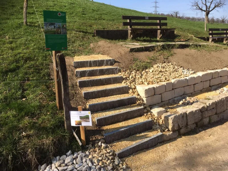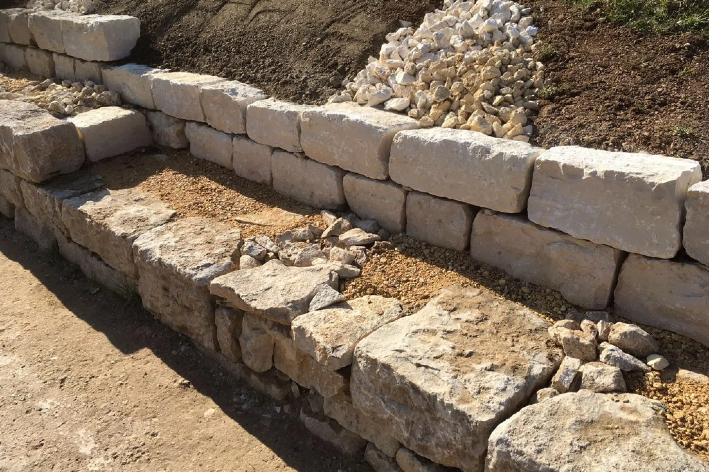 Die Frösche werden jeweils in den Mauerfugen und vorallem hinter der Mauer im sandigen und steinigen Material überwintern. Bei den Arbeiten war darauf zu achten, dass die Fugen zwischen den Steinen genügend gross ausgebildet wurden. Ausserdem wurde beim Hinterfüllen der Mauer auf ein sonst übliches Geotextil verzichtet. Ein solches Vlies würde den Durchgang durch die Steinfugen bis in das sandige Material für die Frösche versperren. Für die Mauer, wie auch für die Hinterfüllung wurde heimischer Jura-Kalk verwendet.