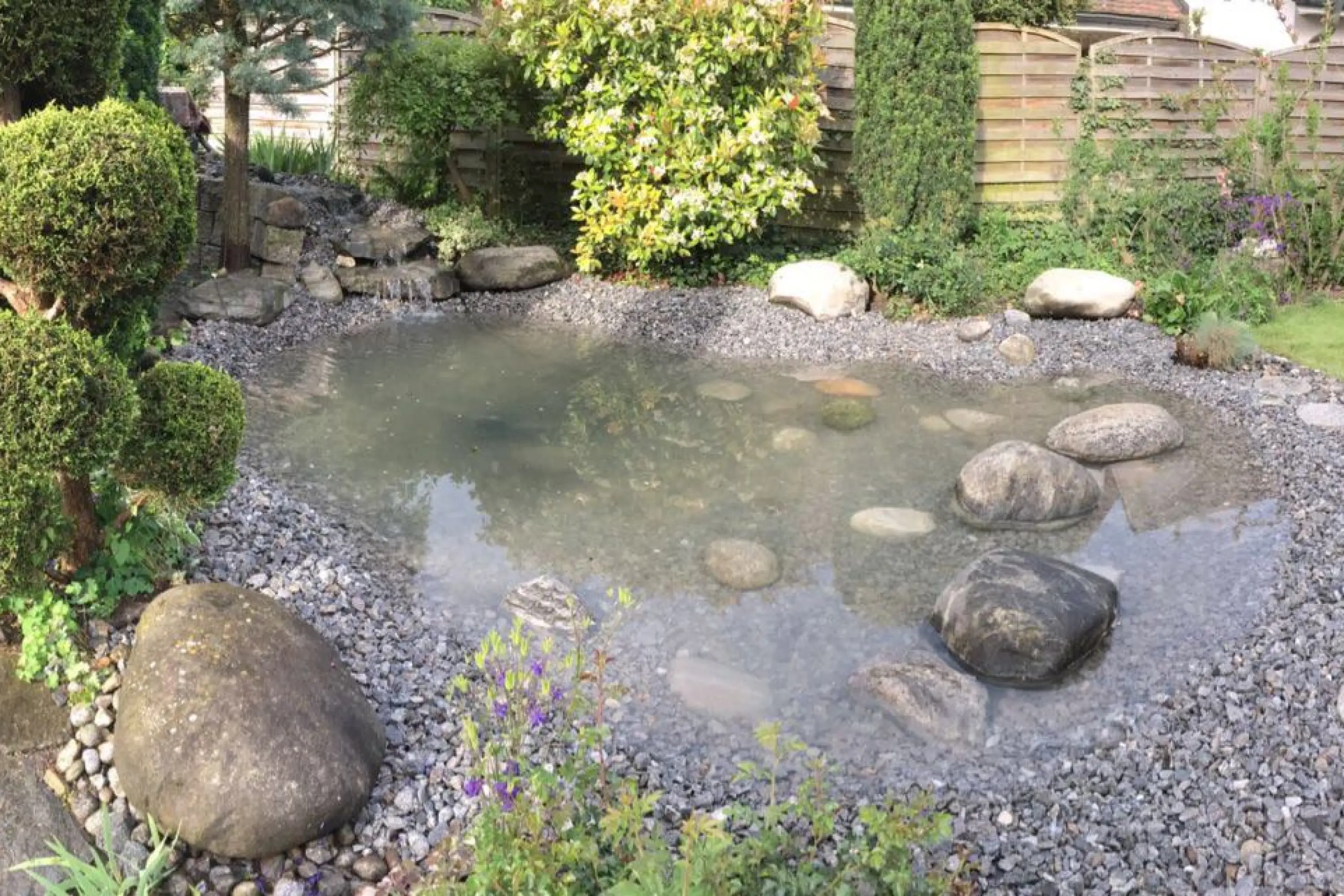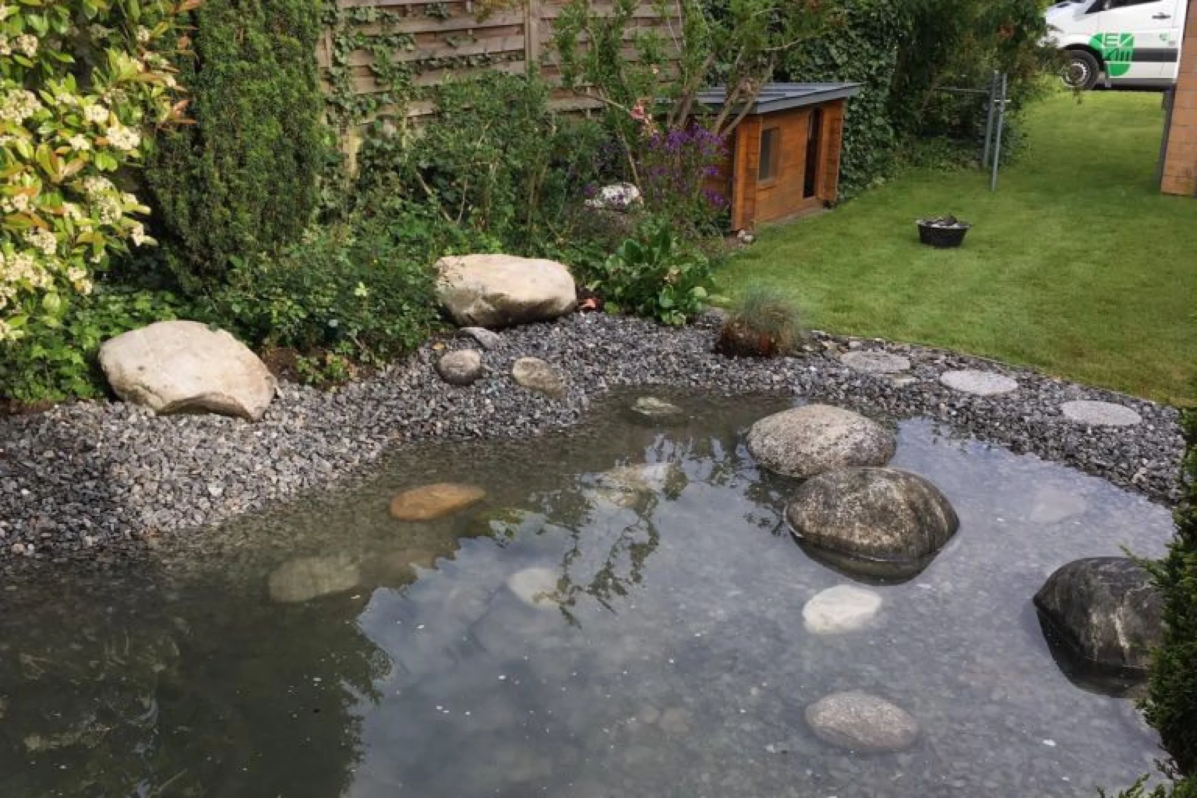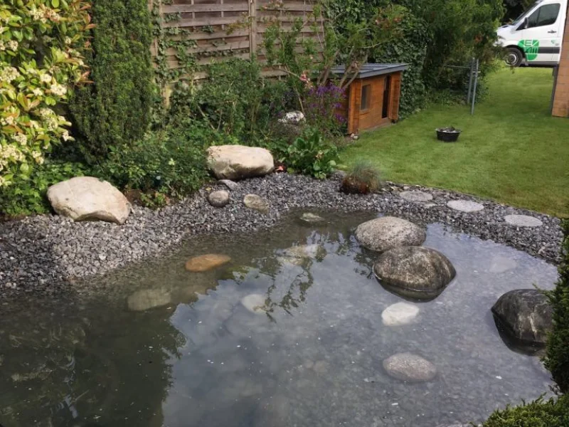Nach dem Ausräumen des Schlammes wurde der Teich mit einer EPDM Kautschuk-Folie neu abgedichtet und anschliessend mit Granitkies und Findlingen neu ausgestaltet.