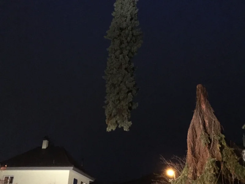 Durch die starken Luftböen und die intensiven Regenfälle in den vergangenen Nächten wurde das Wurzelwerk dieser Fichte teilweise aus dem Boden gerissen. In der Folge hatte der Baum Schieflage. Aus Sicherheitsgründen musste darum diese Pflanze kurzfristig entfernt werden.