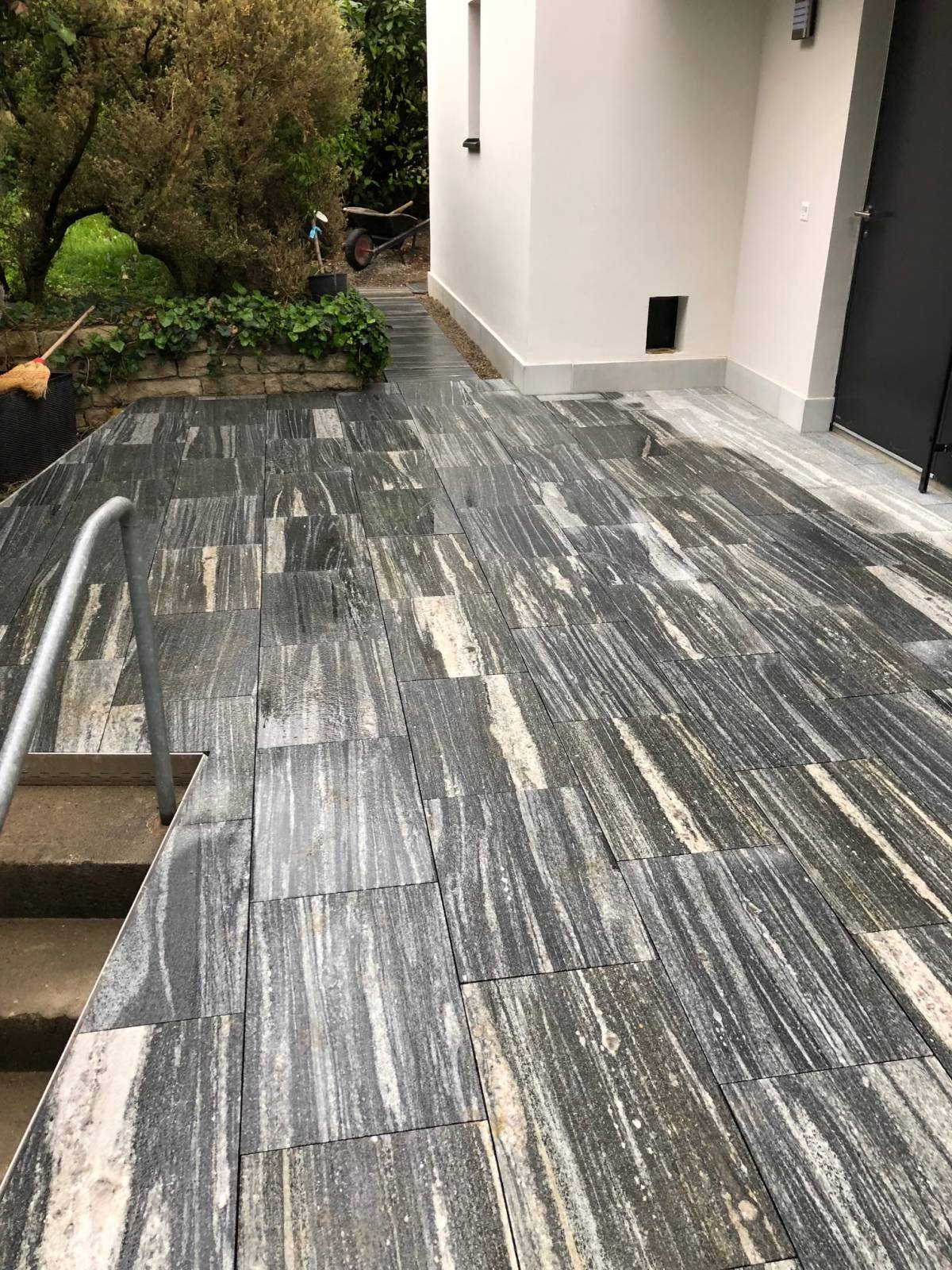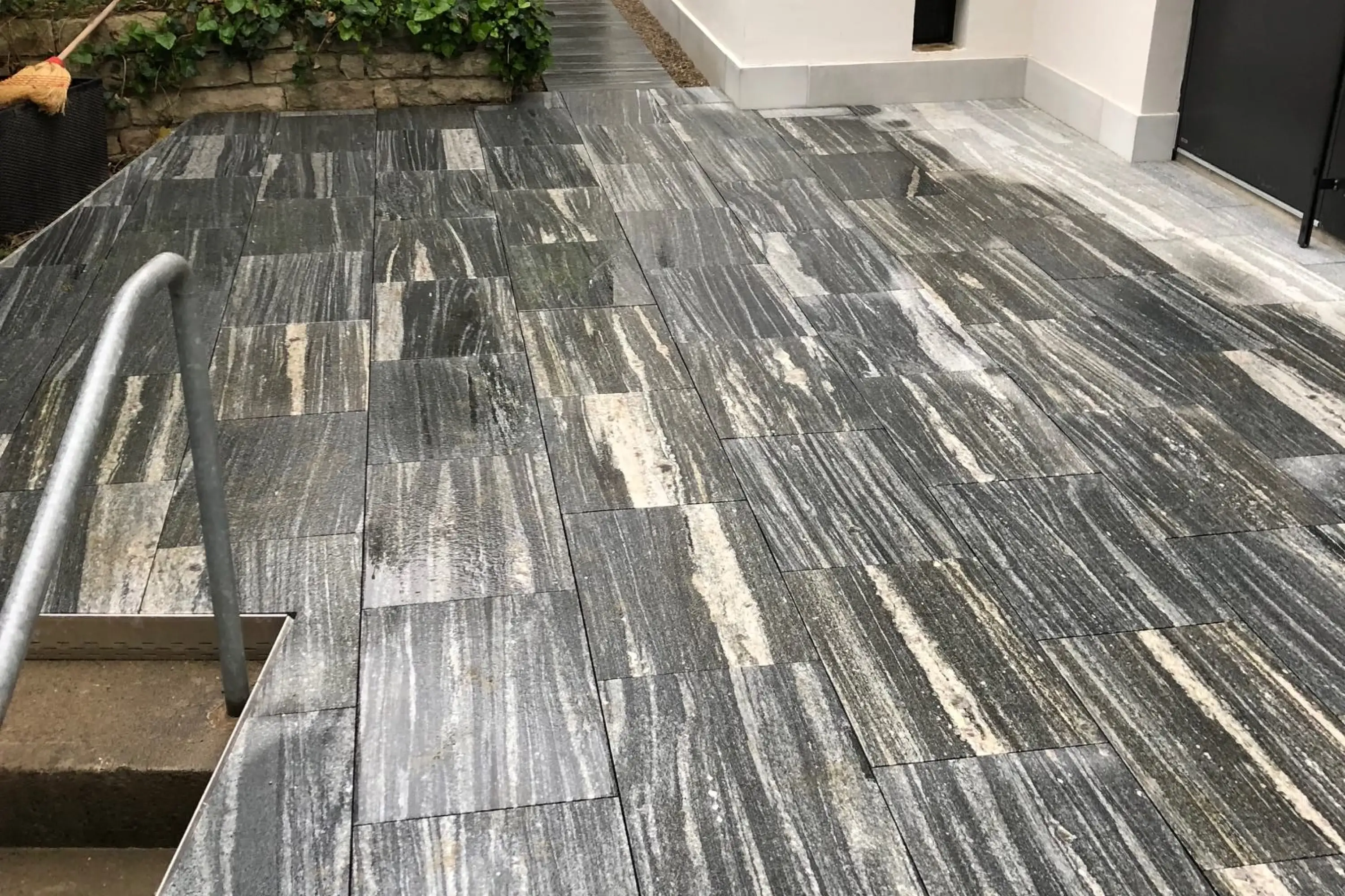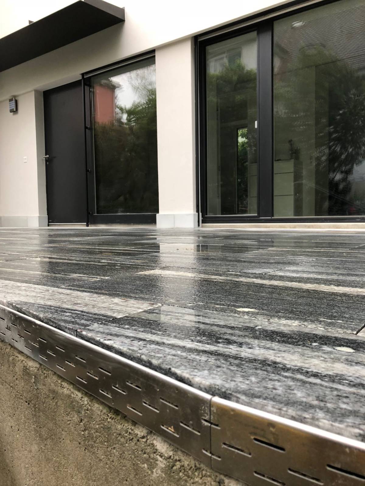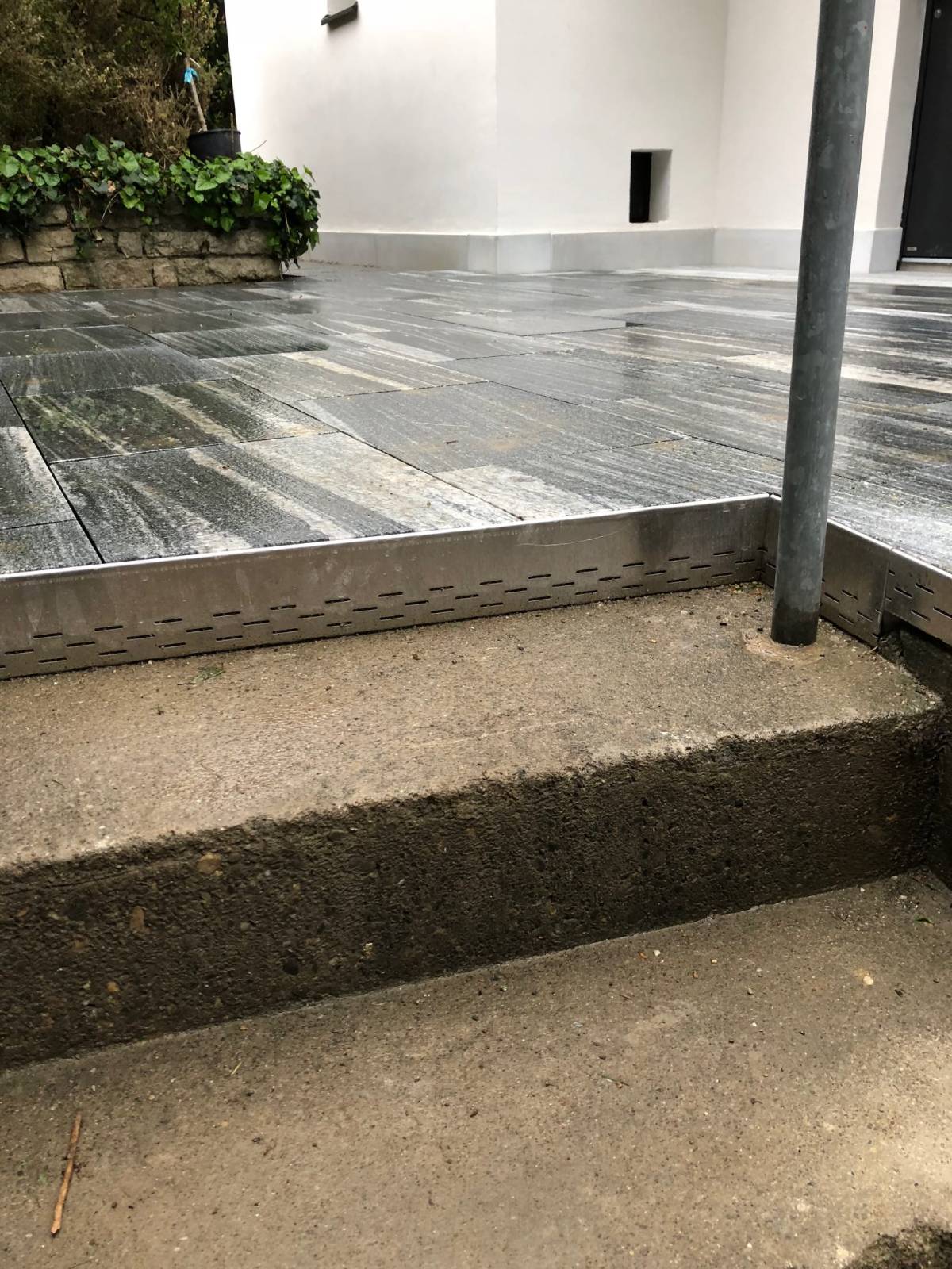 Beton wirkt eintönig und langweilig - darum wurden in diesem Eingangsbereich Natursteinplatten auf die Betondecke verlegt. Kontaktieren Sie uns für Natursteinarbeiten aller Art!