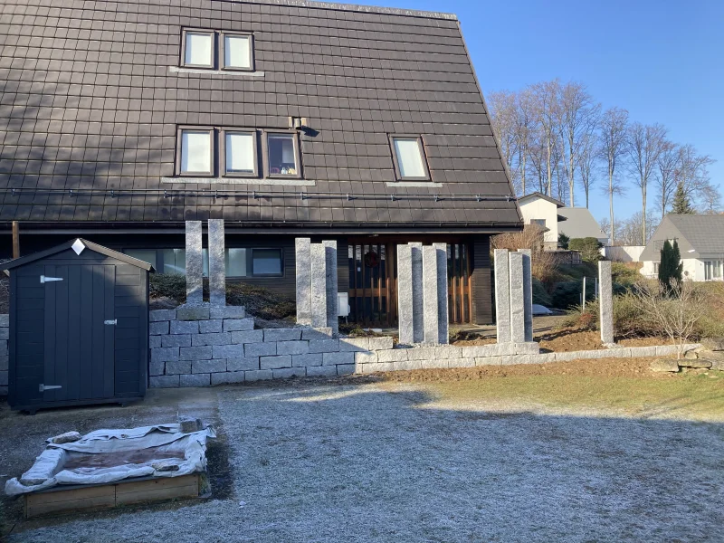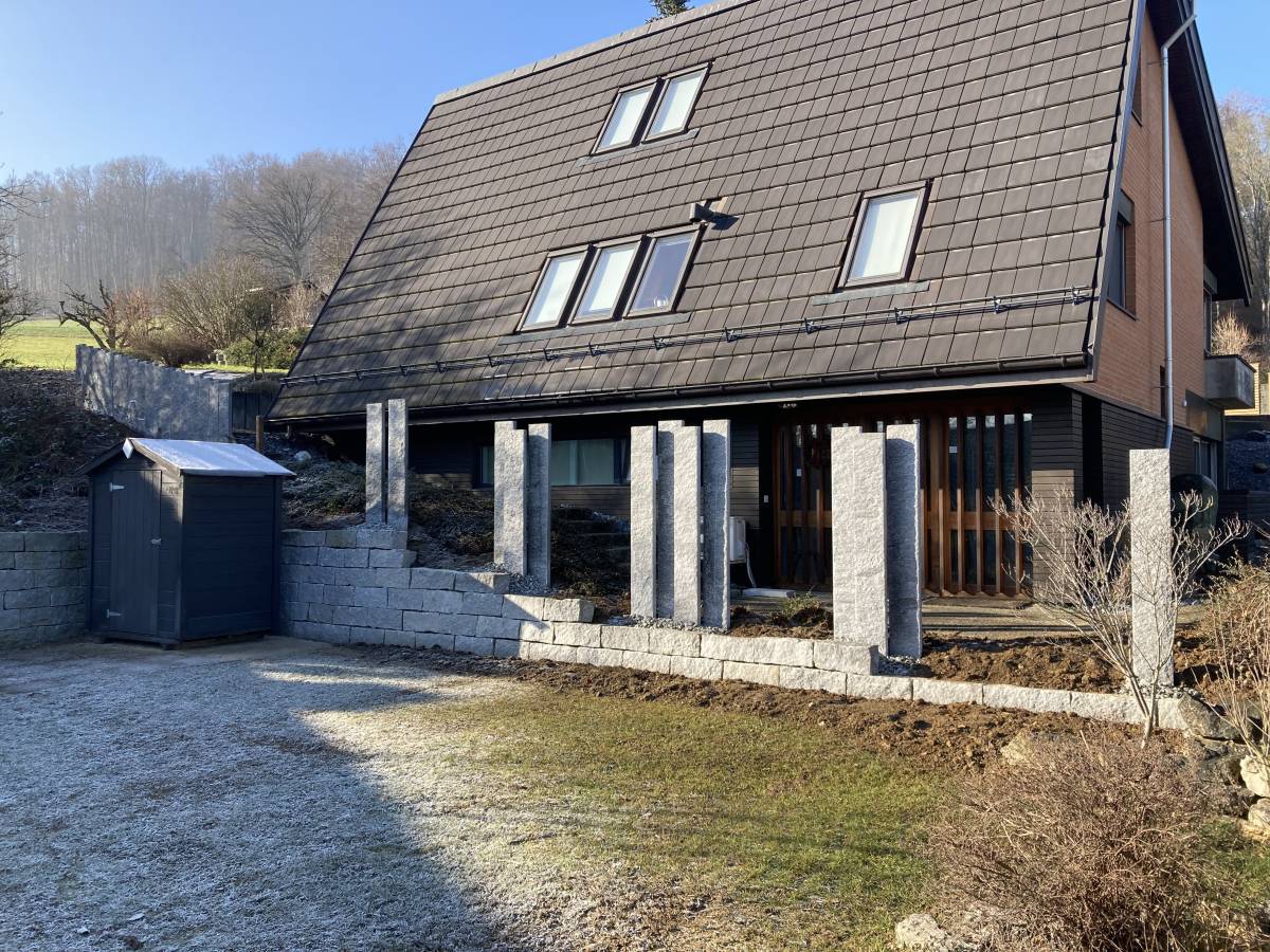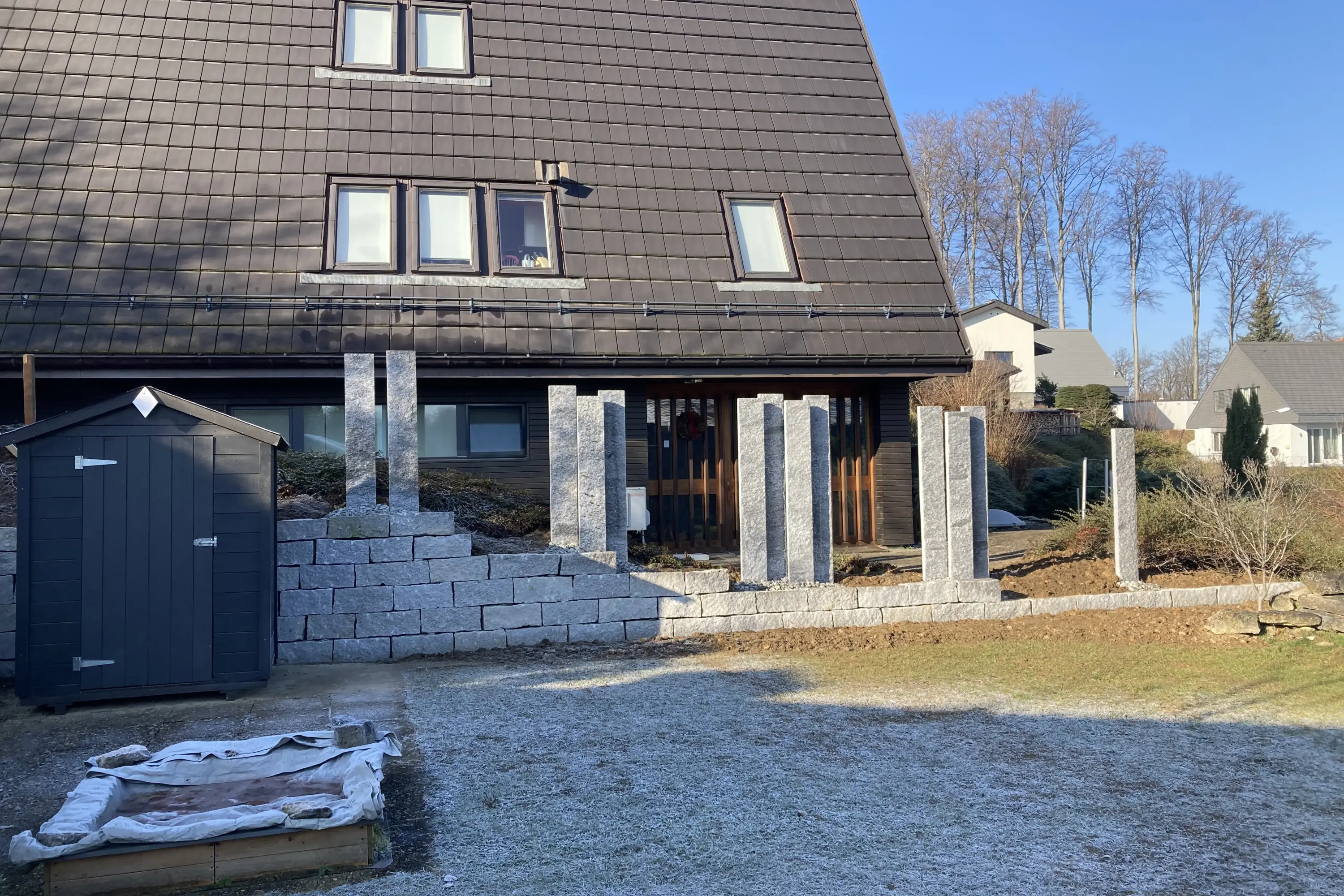Die Stützmauer wurde mit Portugal-Granitsteinen erstellt. Die Sichtschutzpalisaden dienen einerseits als Sichtschutz und andererseits als interessantes Gestaltungselement.